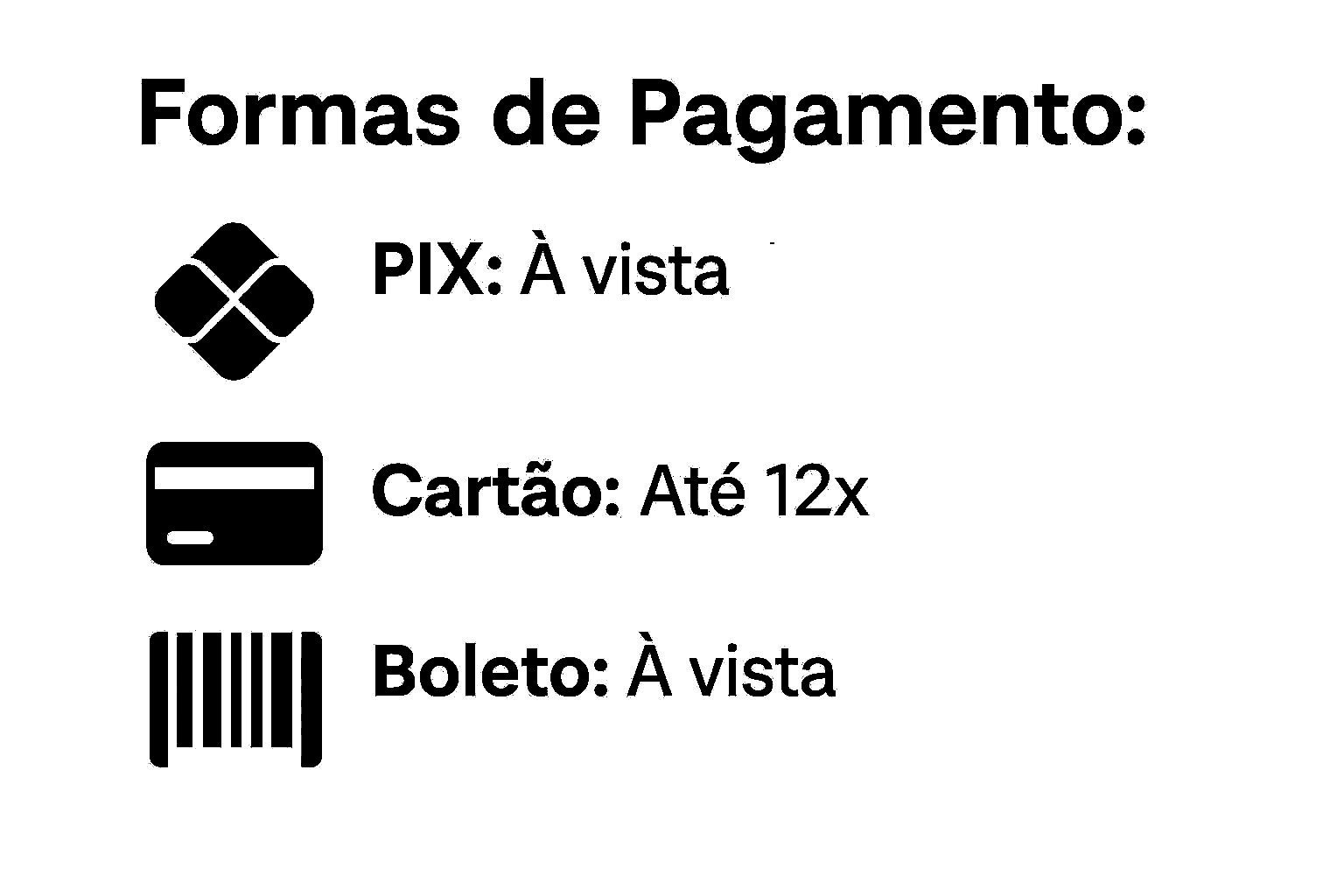 Aceitamos PIX, cartões de crédito das principais bandeiras como Mastercard, Visa, Elo e boleto bancário com total segurança através das plataformas. Você pode parcelar sua compra em até 12x no cartão de crédito com possibilidade de dividir o valor em dois cartões diferentes. Não é possível parcelar no boleto bancário, pois ele é válido apenas para pagamento à vista.